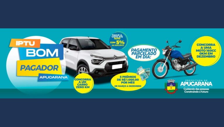 APUCARANA LANÇA IPTU BOM PAGADOR 2026 COM R$ 50 MIL EM PRÊMIOS, CARRO E MOTO ZERO