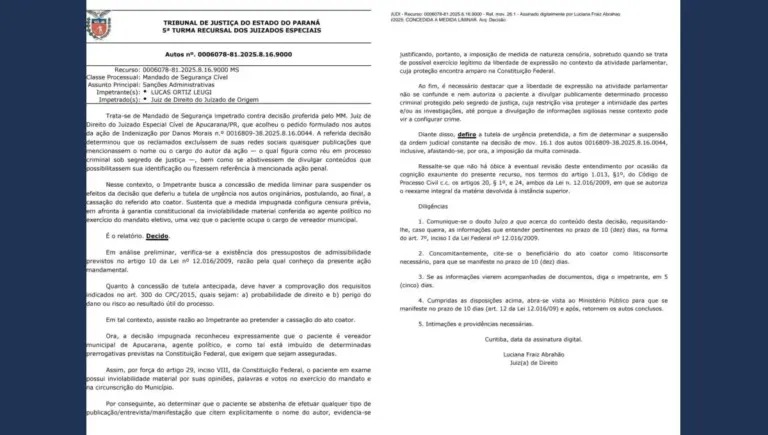 O Tribunal de Justiça do Estado do Paraná (TJPR), por meio da 5ª Turma Recursal dos Juizados Especiais, concedeu medida liminar no Mandado de Segurança impetrado pelo vereador Lucas Ortiz