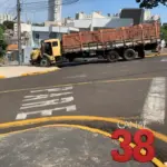 Veículo pesado bloqueia via após não conseguir realizar curva na Rua Ouro Branco, em Apucarana