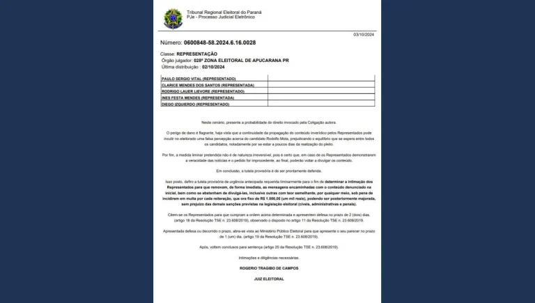A Justiça Eleitoral de Apucarana, por meio do juiz Rogério Tragibo de Campos, na quinta-feira (03/10) deferiu uma liminar em uma representação eleitoral por propaganda negativa e desinformação proposta pela