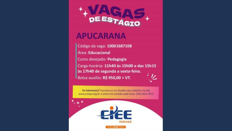 Estudantes do curso de Pedagogia que buscam ingressar no mercado de trabalho têm uma nova oportunidade de estágio disponível em Apucarana. A vaga foi divulgada pelo Centro de Integração Empresa-Escola