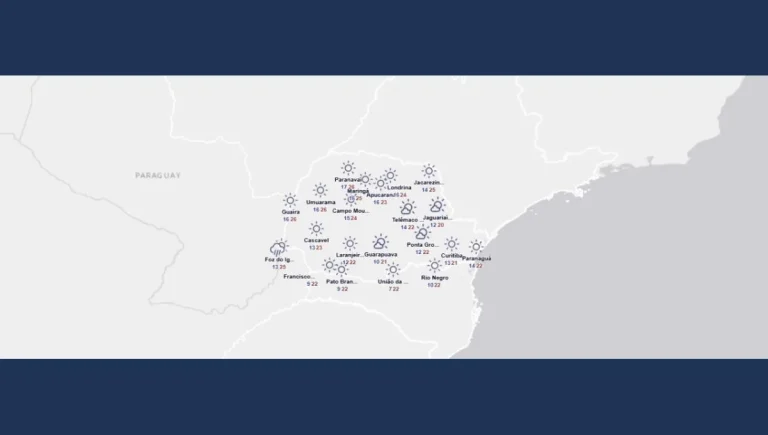 Na segunda-feira, após a passagem da frente fria, uma massa de ar frio e seco se estabelece sobre a “metade-sul” do PR. Nessa região, as temperaturas mínimas ao amanhecer devem