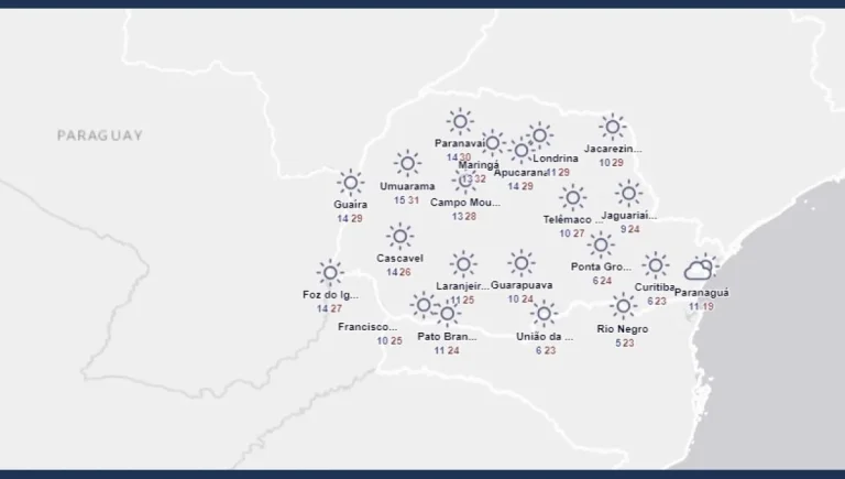 Nesta quarta-feira, o tempo se mantém estável, sem chuvas, no Paraná, ainda sob o domínio da massa de ar mais frio e seco. Faz frio novamente no amanhecer, com risco