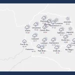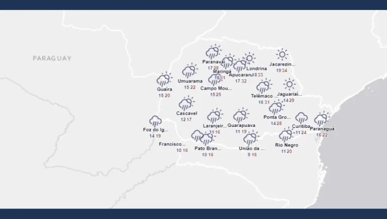 Uma nova frente fria se organiza e há previsão de chuva entre o oeste, sudoeste e sul do Paraná já na madrugada de sexta-feira. Chove também nas demais regiões paranaenses