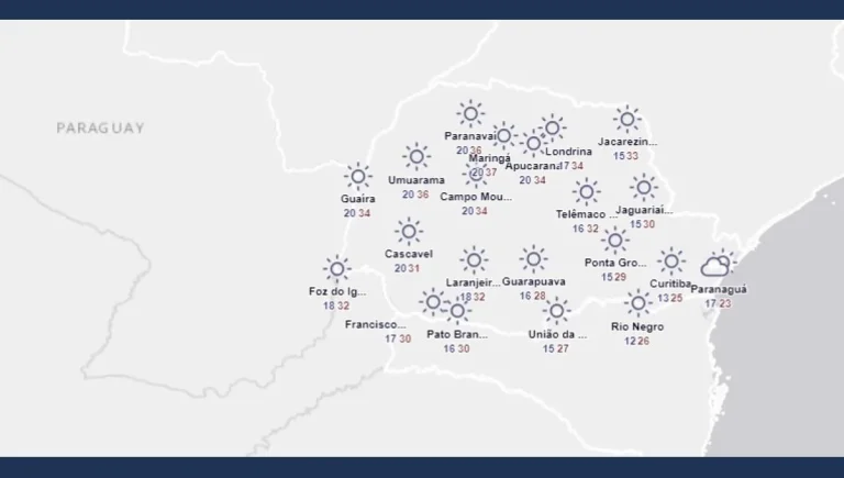 Na quinta-feira, o tempo segue estável em grande parte do Paraná. O destaque fica por conta do calor da tarde, com temperaturas acima dos 35°C no noroeste e no norte.