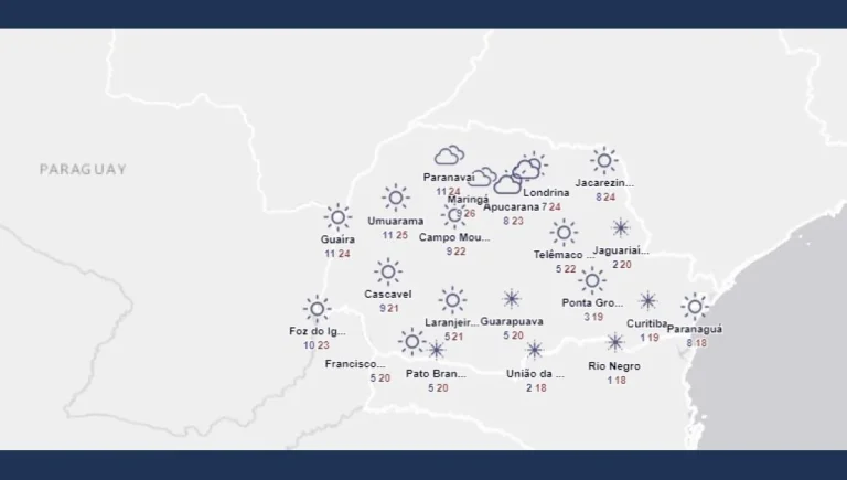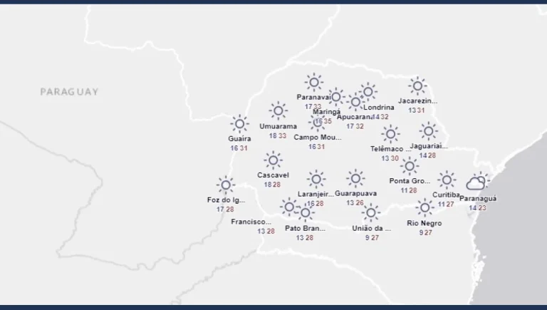 A semana começa sem mudanças nas condições do tempo no Paraná, ou seja, a massa de ar quente e seco permanece atuando sobre praticamente todas as regiões paranaenses, mantendo o