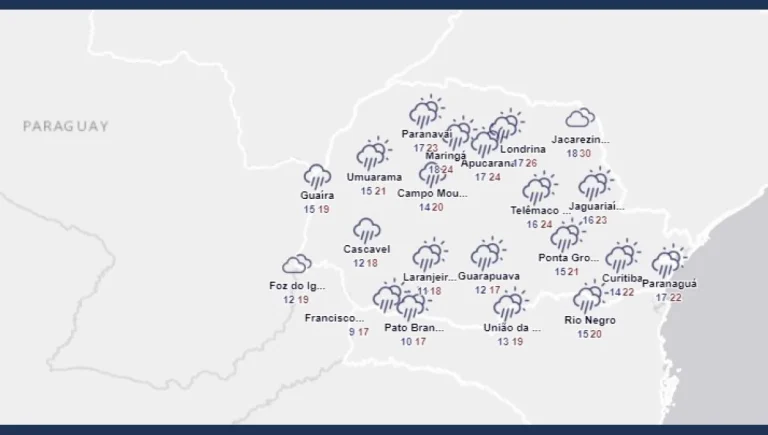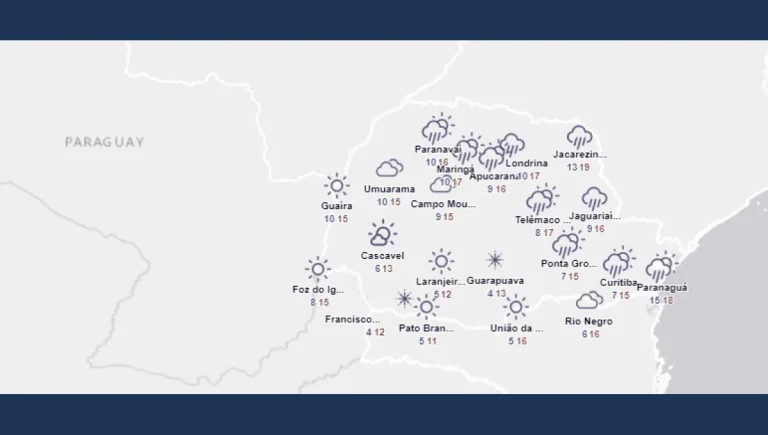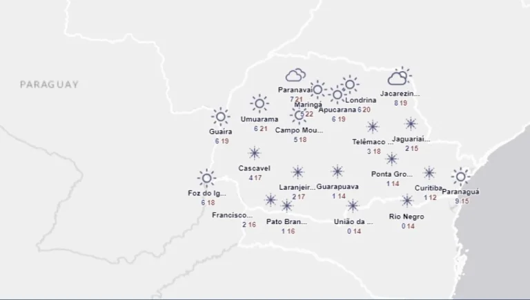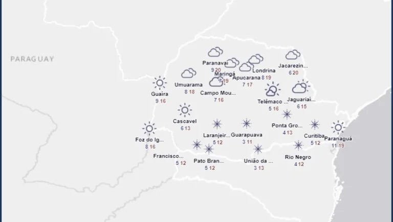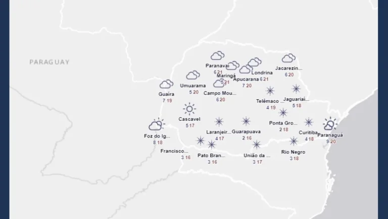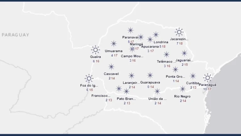 A terça-feira segue sem chuvas no Paraná, ainda em função da presença da massa de ar polar. As temperaturas no amanhecer ficam bastante baixas em todos os setores, com geadas