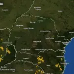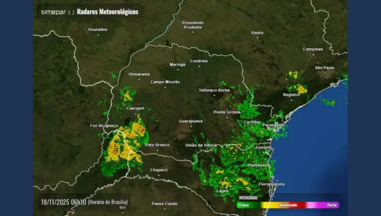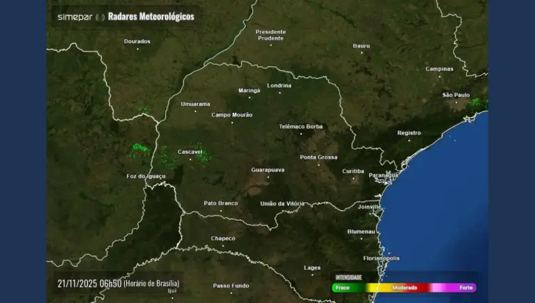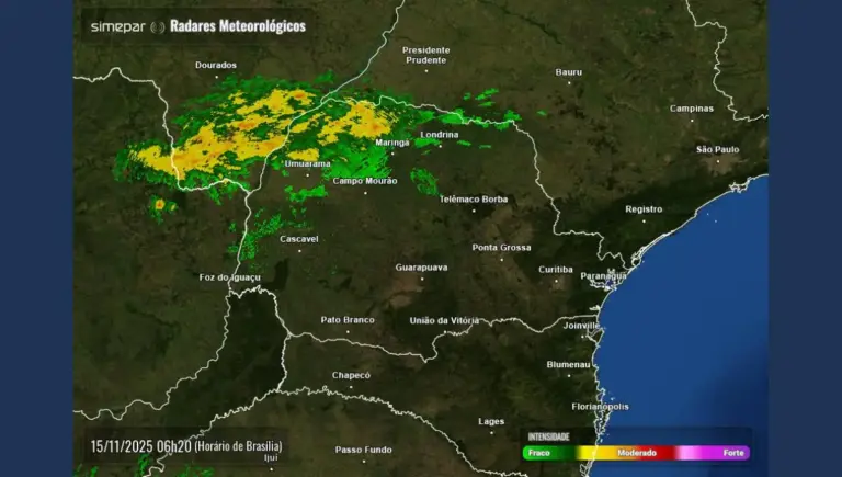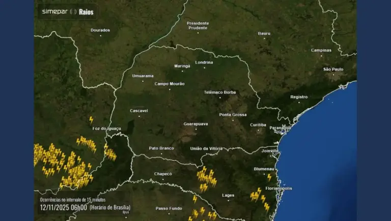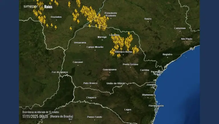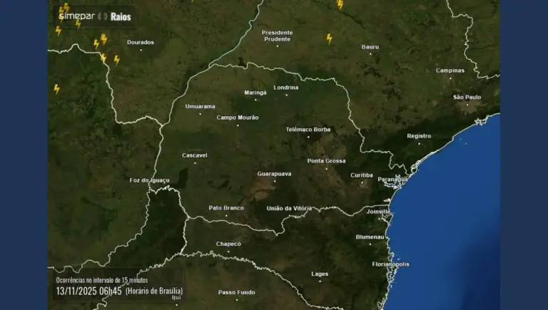 O avanço da frente fria sobre o Paraná apresentou atraso. Para o domingo, espera-se que o sistema intensifique significativamente as condições de instabilidade atmosférica, resultando em tempestades distribuídas por todo
