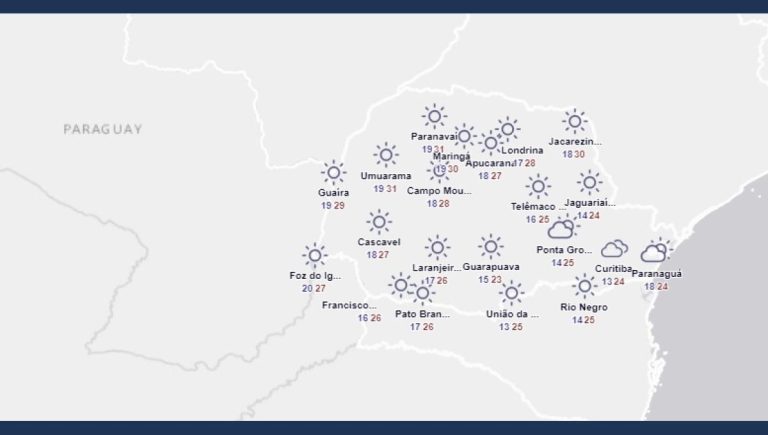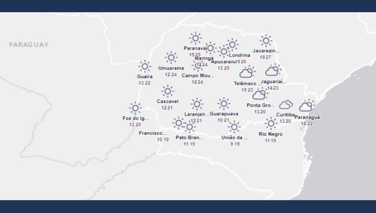 Nesta quarta-feira não teremos chuvas no Paraná. Amanhece com presença de nuvens baixas e/ou nevoeiros entre o centro-sul, Campos Gerais e RMC, mas que perdem força ainda durante o período