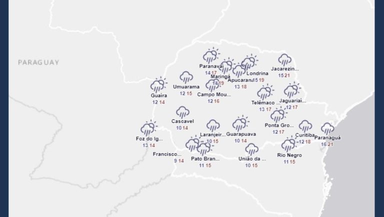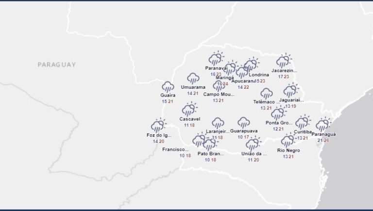 No domingo, o tempo fica instável no Paraná, com chuvas previstas em vários setores. As precipitações, no geral, são de fraca intensidade e ocorrem de forma irregular. Entre a tarde