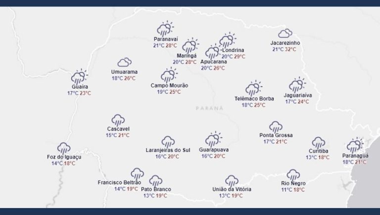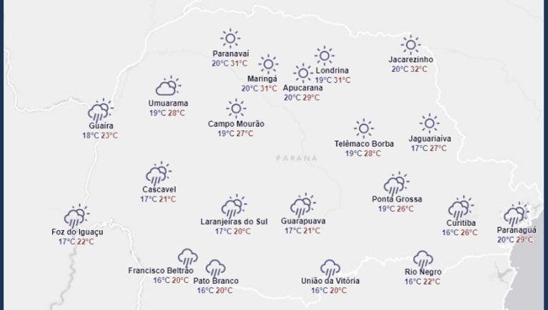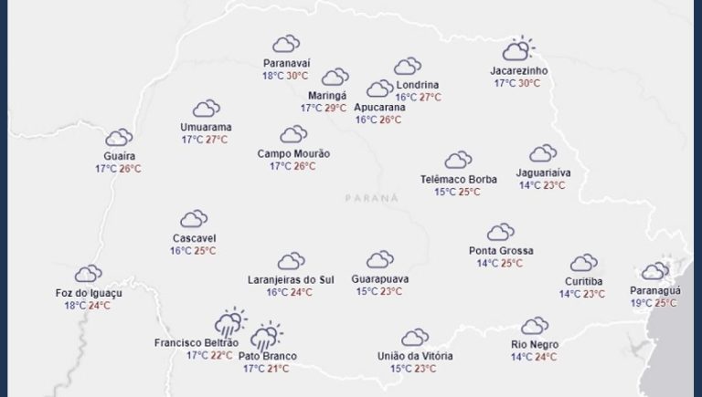 Nesta quarta-feira, ainda fica com muitas nuvens no Paraná. Há condição para chuvas fracas e ocasionais, especialmente entre os Campos Gerais, RMC e o litoral. Faz frio no amanhecer, com