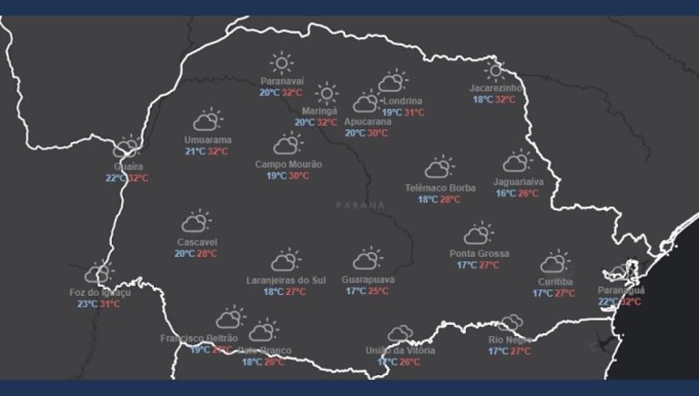 Neste domingo, o tempo fica estável em praticamente todo o Paraná. As temperaturas continuam elevadas em todo estado e as taxas de umidade relativa do ar devem seguir mais baixas