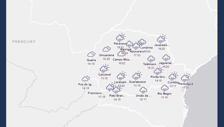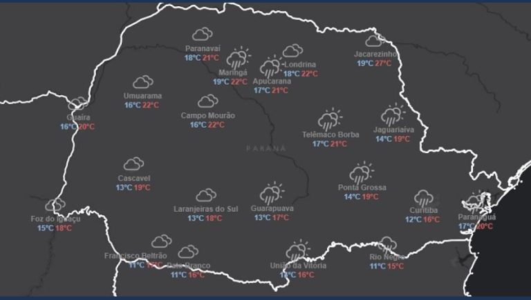 Neste sábado, 18 de maio, o Paraná deve enfrentar condições meteorológicas adversas, com previsão de chuva intensa e queda de temperatura que podem ocorrer a qualquer momento em todo o