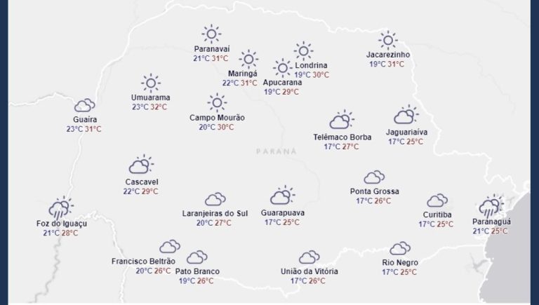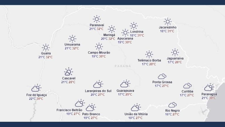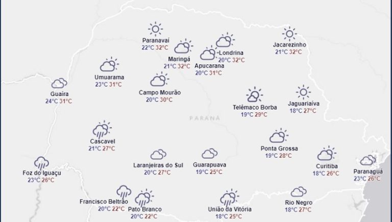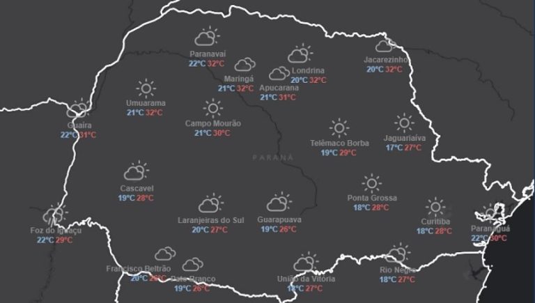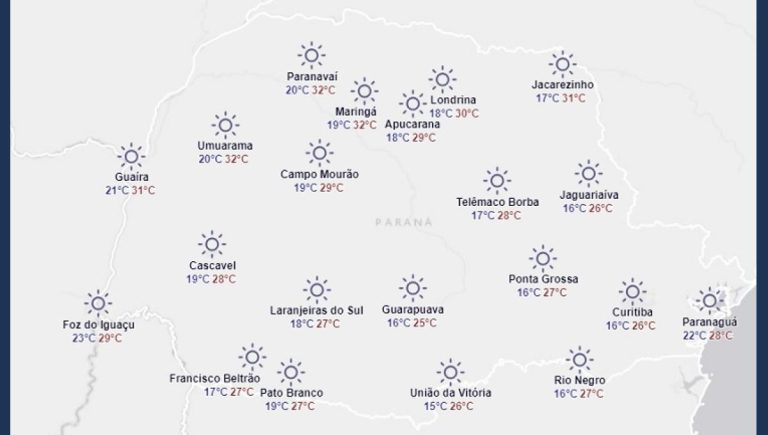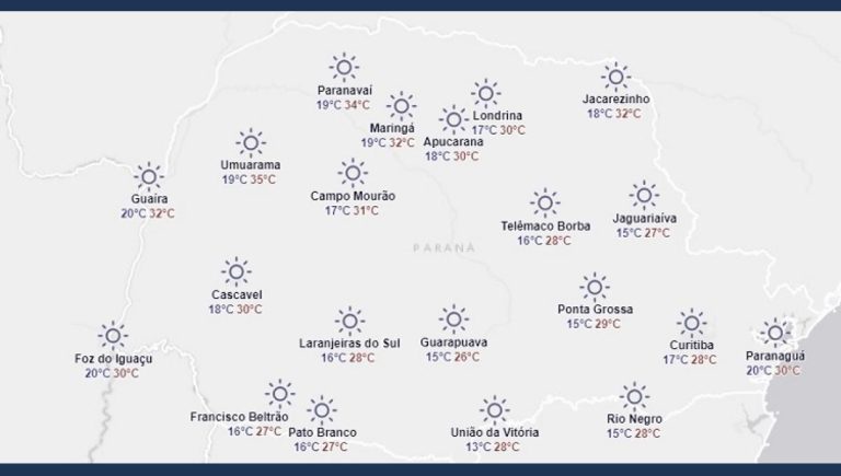 A semana começa com tempo estável nas diversas regiões paranaenses. Assim, o sol predomina desde as primeiras horas do dia, elevando rapidamente as temperaturas, deixando a tarde abafada e com