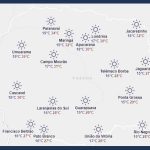 Nesta sexta-feira, a nebulosidade aumenta em todo o leste do Paraná, com chuvas fracas/garoas, principalmente no litoral. Entre o oeste, sudoeste, centro-sul e Campos Gerais, a nebulosidade fica variável, com
