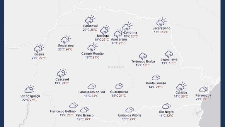 Sexta-feira com tempo instável no Paraná. Enquanto uma frente fria se afasta mais para o oceano na altura da região do estado, uma área de baixa pressão atmosférica, mantém condições