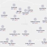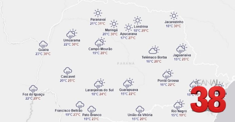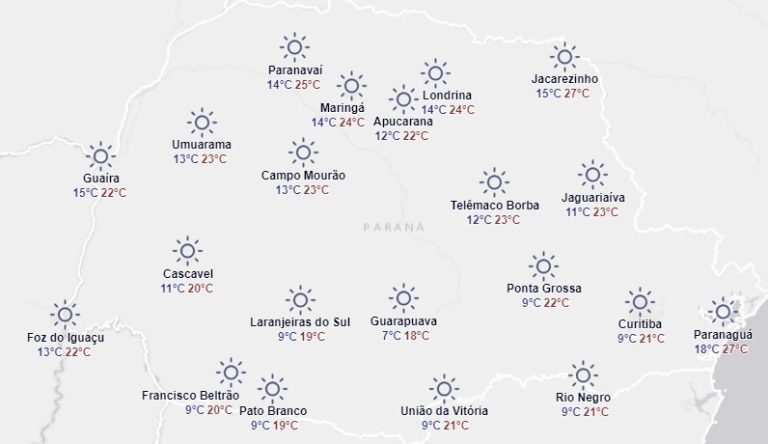 Nesta terça-feira segue o padrão de estabilidade e sem chance de chuva. As temperaturas se elevam um pouco mais em todo o Paraná, mas os setores centro-leste, sul e leste