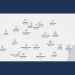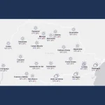 Início de semana com bastante calor no interior do Paraná. Temperaturas em várias cidades passam dos 30°C, com vento predominante de norte alcançando intensidade moderada a forte entre o final