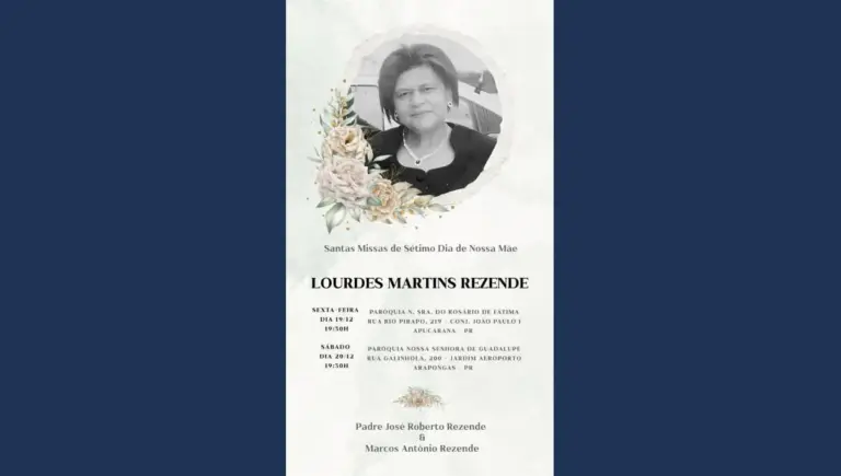Familiares e amigos são convidados a participar das Santas Missas de Sétimo Dia em memória de Lourdes Martins Rezende, momentos de fé, oração e homenagem à sua vida. A primeira