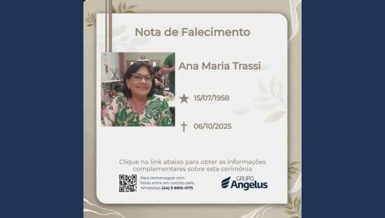 Faleceu nesta segunda-feira (06), em Apucarana, Ana Maria Trassi, aos 67 anos. O velório acontece na Capela Mortuária Central de Apucarana, onde familiares e amigos prestam suas últimas homenagens. O