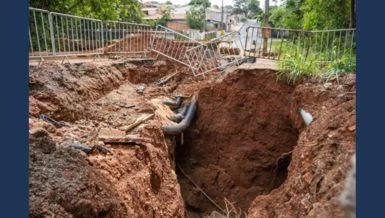 Erosão subterrânea provocou afundamento do asfalto no Núcleo João Paulo; via permanece interditada para garantir a segurança da população. A Prefeitura de Apucarana, por meio da Secretaria Municipal de Obras,