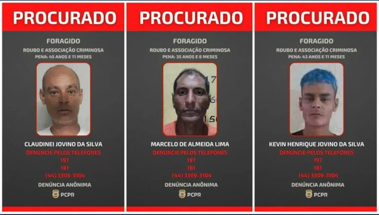 A Polícia Civil do Paraná (PCPR) divulgou nesta quinta-feira (3) as imagens de três homens considerados foragidos da Justiça por envolvimento em uma série de roubos a subestações da Sanepar