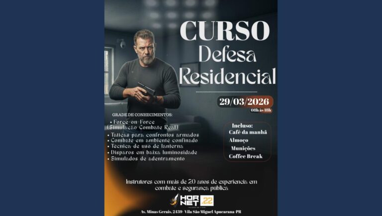 A Hornet .22 Clube de Tiro realiza no próximo dia 29 de março de 2026 um Curso de Defesa Residencial em Apucarana. O treinamento acontece das 8h às 18h, na