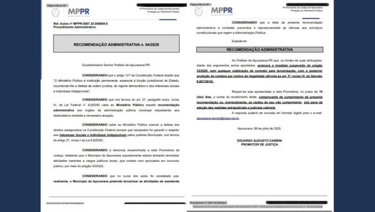 MP aponta irregularidades e recomenda anulação de pregão que prevê terceirização de mais de 570 cargos da Prefeitura de Apucarana