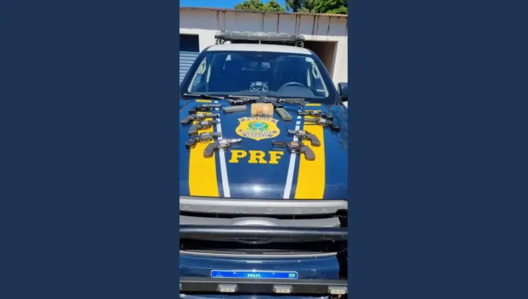 Armamento estava oculto em compartimento adaptado no painel do veículo. A Polícia Rodoviária Federal (PRF) apreendeu, na segunda-feira (5), um fuzil calibre 5.56, nove revólveres, três carregadores, uma mira holográfica