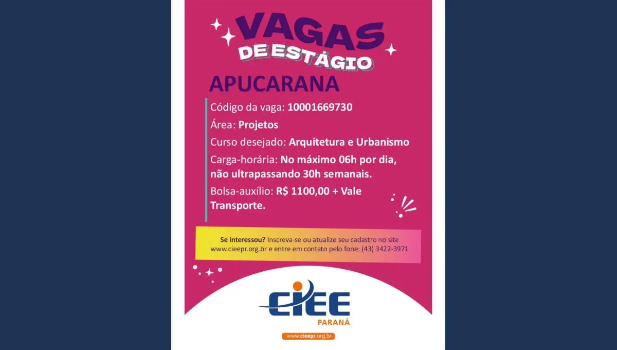 O Centro de Integração Empresa-Escola (CIEE) divulgou recentemente oportunidades de estágio para estudantes de Apucarana, abrangendo diversas áreas do conhecimento e oferecendo bolsas-auxílio com valores variados, além de vale-transporte.