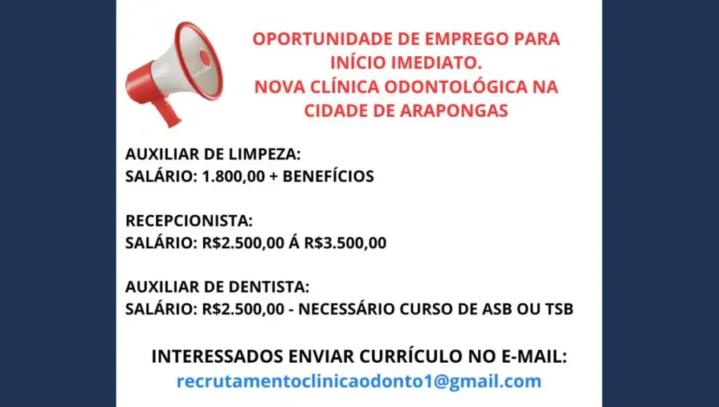 Moradores de Arapongas que estão em busca de uma oportunidade no mercado de trabalho podem aproveitar as vagas abertas por uma nova clínica odontológica que está em fase de implantação na cidade. A seleção é para início imediato e contempla diferentes funções na área administrativa e de apoio.