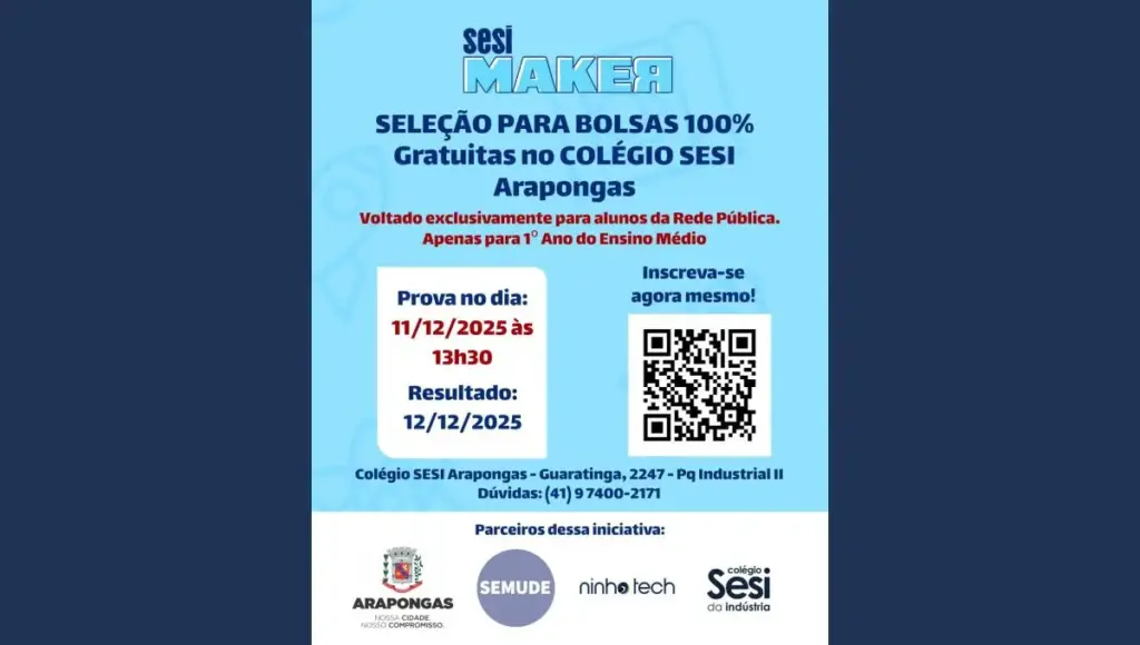 A Prefeitura de Arapongas, por meio da Secretaria Municipal de Desenvolvimento, Inovação, Trabalho e Renda (SEMUDE), informa que estão abertas as inscrições para o processo seletivo que vai conceder bolsas integrais para estudar no Colégio SESI. A prova será nesta quinta-feira, 11, às 13h30, na Rua Guaratinga, nº 2247, Parque Industrial II, e é destinada a alunos da Rede Pública que vão ingressar no 1º ano do Ensino Médio em 2026.