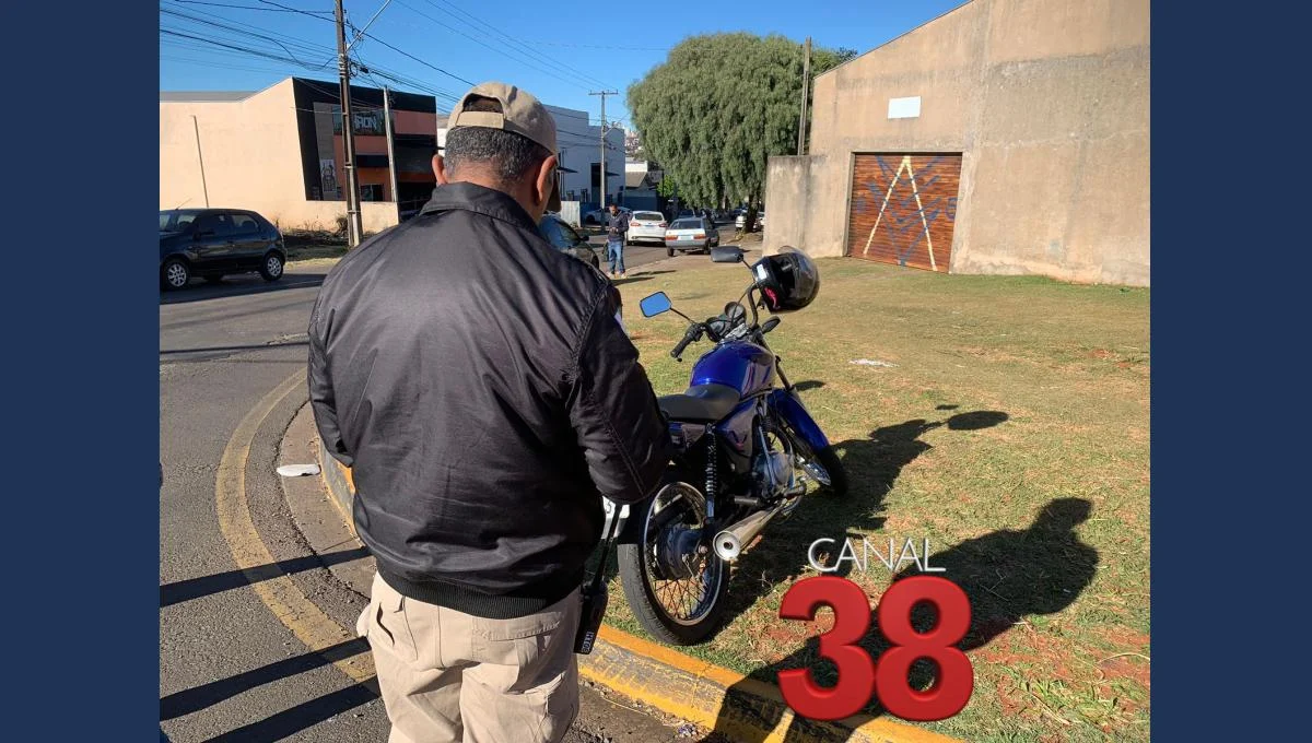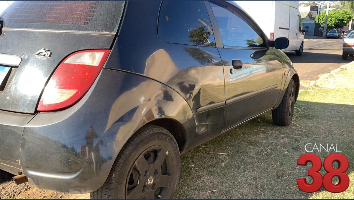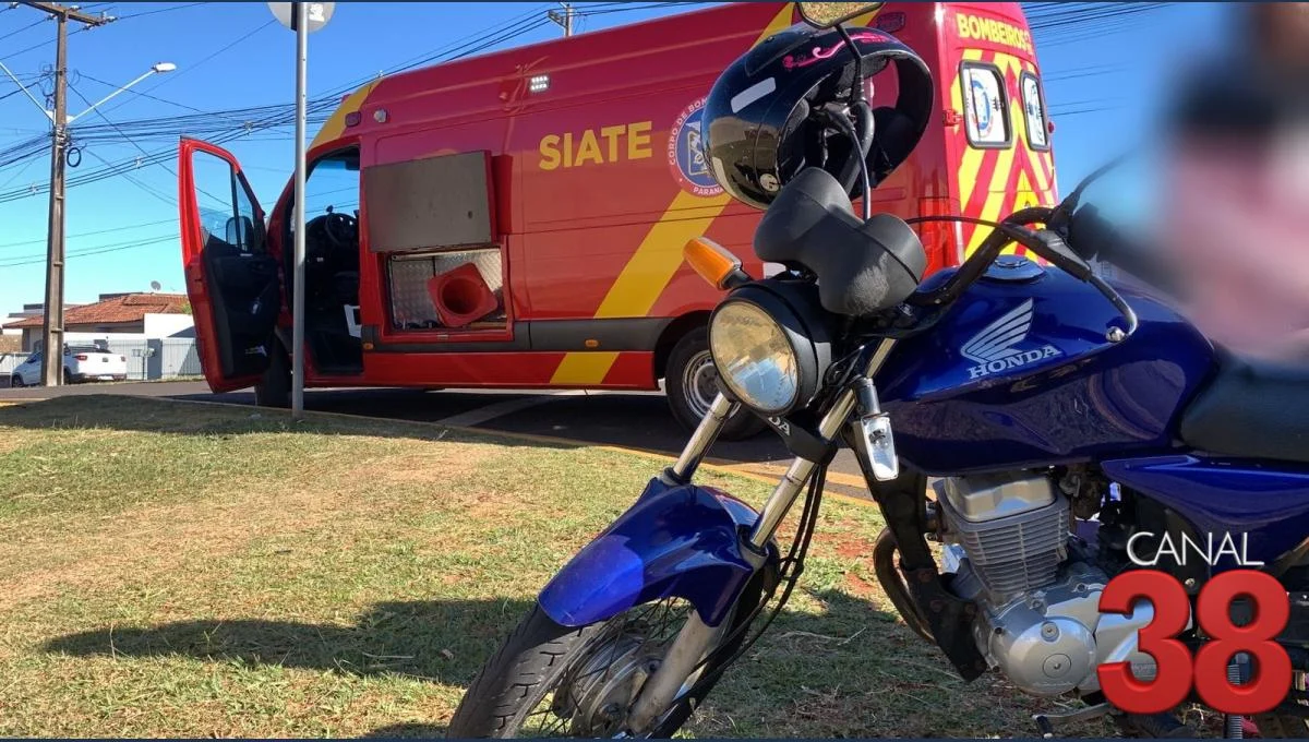 Nesta quarta-feira (13), uma colisão entre um Ford Ka e uma motocicleta foi registrada na rotatória da Avenida Pinho Araucária, em Apucarana.