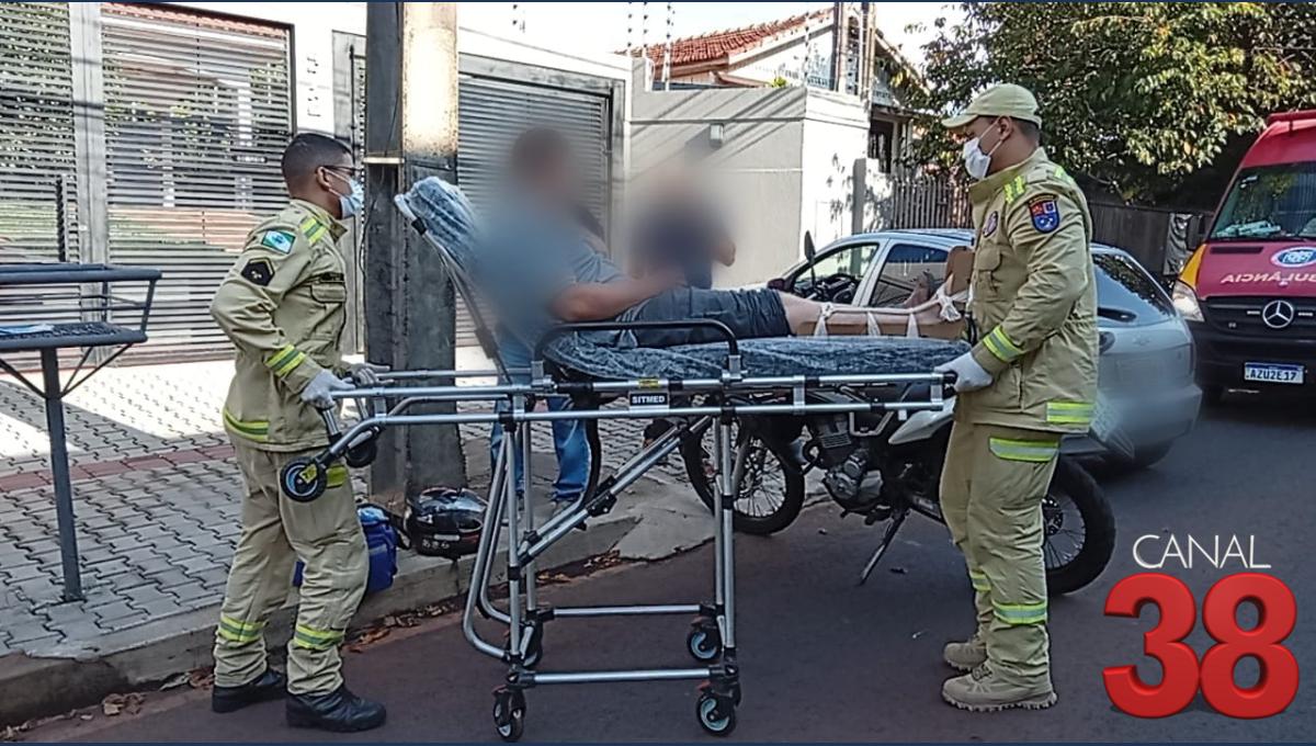 “A gente foi acionado pelo nosso telefone de emergência, o 193. Chegando lá no local, a gente se deparou com um carro e uma moto. A vítima era o condutor da moto, um masculino de 26 anos. A moto acabou prensando a perna dele, então ele teve contusão na perna direita e na mão direita também”, explicou.