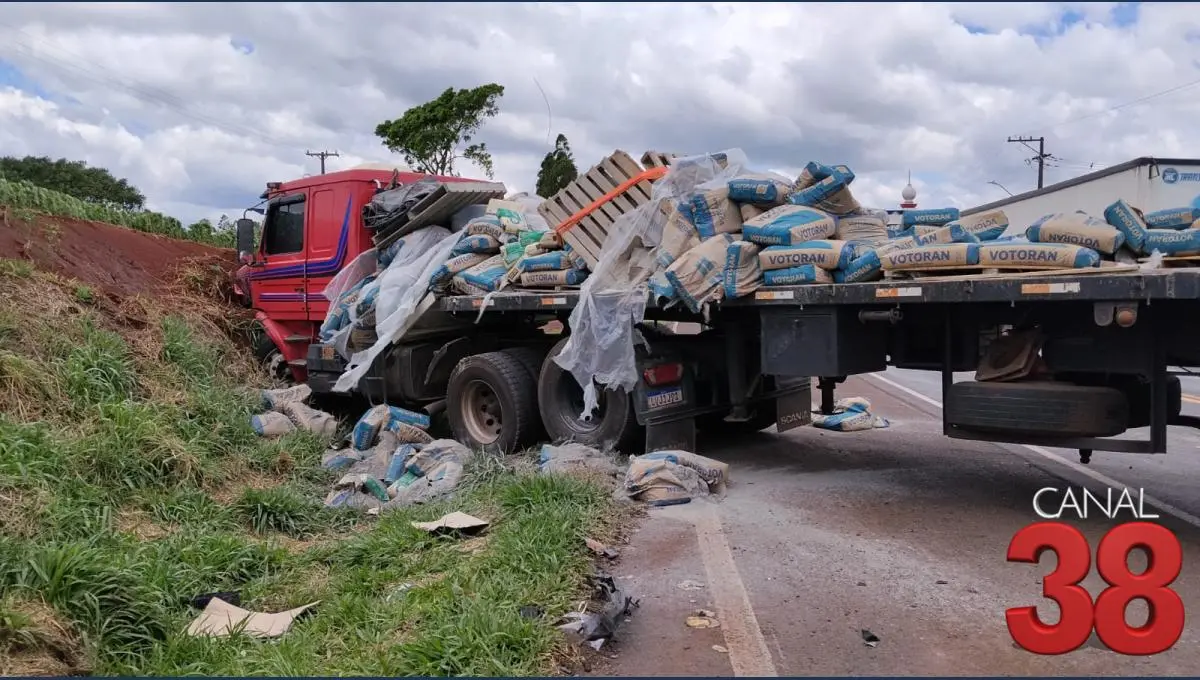 O acidente provocou queda de parte da carga de cimento sobre a pista, o que exigiu a interdição parcial da rodovia.