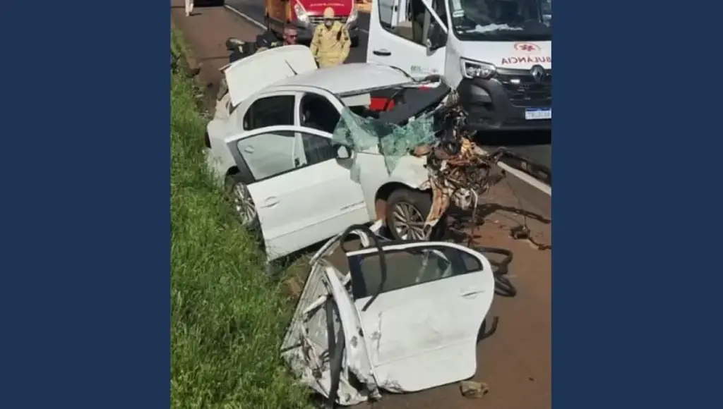 Com a força da batida, a porta do carro foi arrancada e a frente do veículo ficou completamente destruída. O caminhão acabou tombando no canteiro lateral da rodovia, espalhando parte da carga de milho pelo local. O carro foi lançado até o acostamento do sentido oposto.