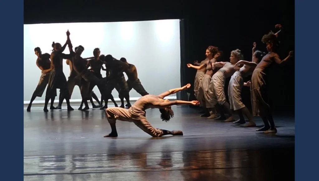 Mais do que sequências coreográficas, os dois trabalhos criam uma experiência imersiva a respeito de dilemas do tempo atual. Em “V.I.C.A.”, a coreógrafa Lili de Grammont parte do acrônimo foramado pelas palavras Volátil, Incerto, Complexo e Ambíguo para construir um mosaico de situações que ora fragmentam, ora revelam possibilidades de conexão entre os indivíduos. Com inspiração nas ideias de Zygmunt Bauman e no cenário social pós-pandêmico, a obra atravessa temas como catástrofes, Inteligência Artificial, solidão e coletividade, mesclando força física, delicadeza e visualidade impactante.