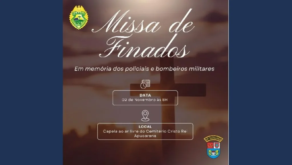 O Tenente-Coronel Robson Falk Vieira, Comandante do 10º Batalhão de Polícia Militar, convida toda a comunidade para a Missa de Finados, que será realizada em memória dos policiais e bombeiros militares.