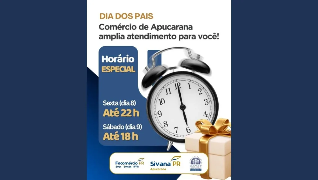 Em preparação para o Dia dos Pais, o comércio de Apucarana funcionará em horário especial nesta sexta-feira e no sábado, dias 8 e 9 de agosto. A iniciativa visa oferecer mais comodidade aos consumidores e fomentar as vendas no setor varejista da cidade.