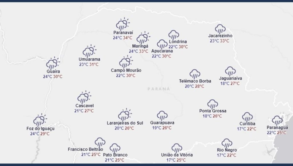 Em função da incursão de ar mais frio a partir do leste, as temperaturas na metade oriental paranaense ficarão mais amenas, com máximas que poderão não superar os 20 °C na RMC e no Centro-Sul.
