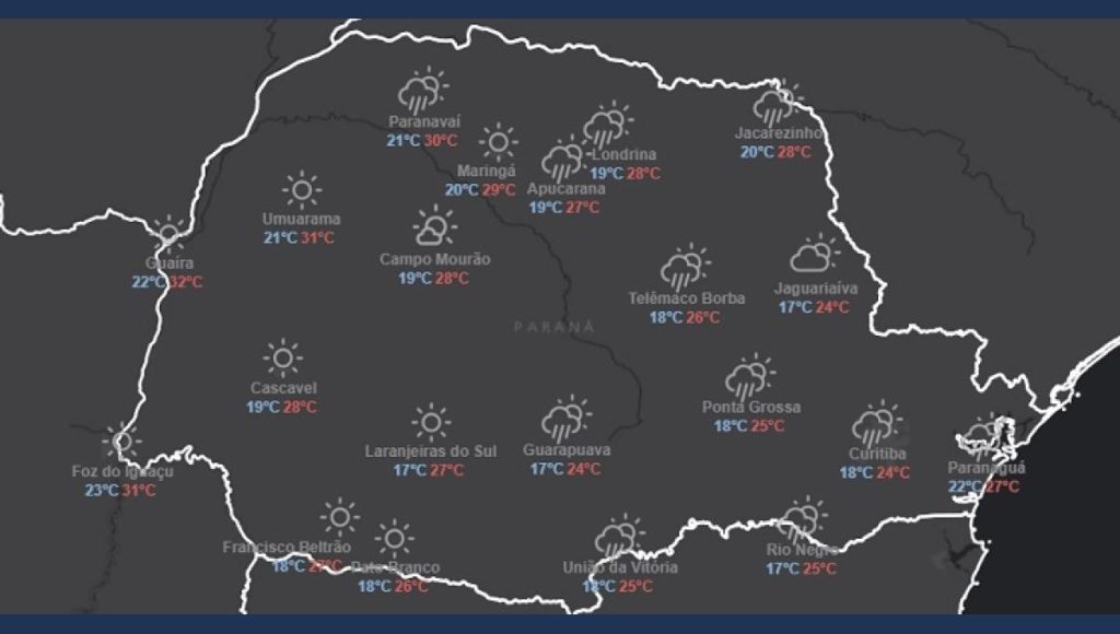 Na sexta-feira teremos condições bem típicas da estação do verão no Paraná. Durante a manhã o sol aparece com mais intensidade, favorecendo a elevação das temperaturas. Principalmente a partir da tarde há previsão de chuvas rápidas e localizadas em boa parte do estado. Não se descarta ocorrência de tempestades pontuais.