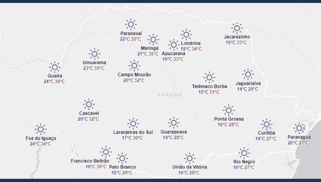 As temperaturas na quinta-feira (14) em Apucarana e região devem oscilar entre a mínima de 21ºC e a máxima de 34ºC, conforme o Simepar.