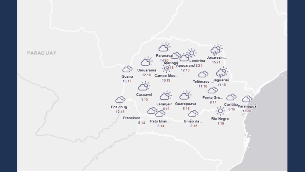 Ainda fica com presença de muita nebulosidade em vários setores paranaenses, mas apenas com garoa ocasional a partir da tarde entre o leste e o norte pioneiro. Destaque fica por conta do forte resfriamento. Faz bastante frio no amanhecer, principalmente na “metade sul” do estado. À tarde, as temperaturas ficam amenas.