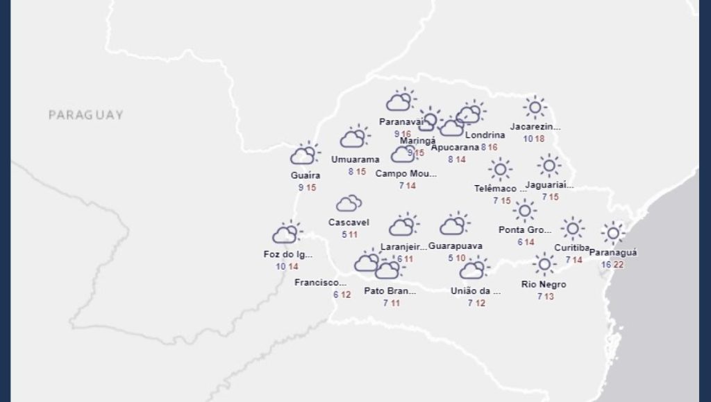 Predomínio de sol ao longo do dia, mas, mesmo assim, não esquenta muito na maioria das regiões paranaenses.