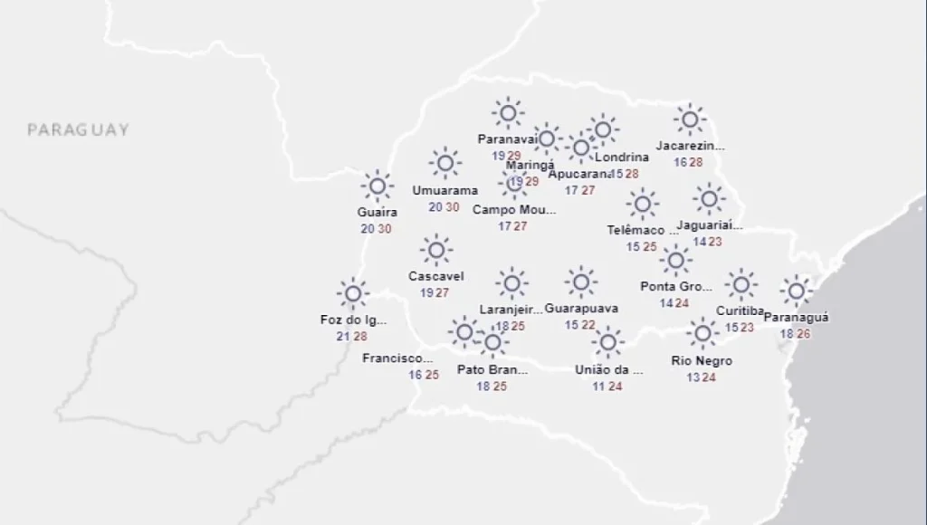 Sexta-feira de tempo seco nas regiões do Paraná. Expressiva amplitude térmica ao longo do dia.