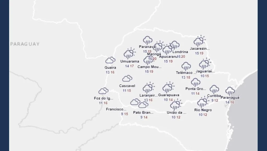 Inicio de semana com tempo instável no Paraná. Uma frente fria avança e sai para o oceano na altura da região do Paraná. Muita nebulosidade e algumas chuvas ao longo dia, enquanto as temperaturas apresentam uma elevação mais lenta na maioria dos setores, embora mais frio entre o Sul e o Leste (Campos Gerais).