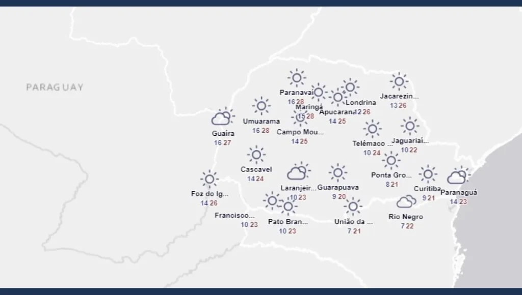No litoral paranaense, há maior concentração de nuvens ao longo do dia, até mesmo com restrição de visibilidade por vários momentos. No amanhecer ainda faz frio entre o centro-sul, Campos Gerais e RMC.