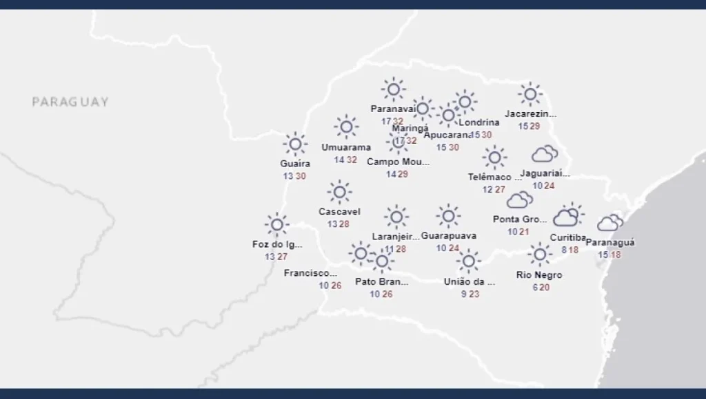 No amanhecer teremos temperaturas abaixo dos 10 °C em vários setores (sudoeste, centro-sul, Campos Gerais e RMC). À tarde será de temperaturas mais elevadas no noroeste e norte, com valores ligeiramente acima dos 30 °C.