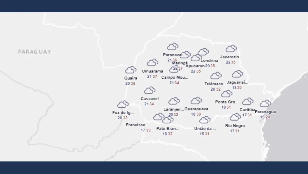 Esquenta bastante à tarde, com exceção do Litoral que ainda deve apresentar baixa amplitude térmica, em função da presença de nuvens. Destaque também para os baixos índices de umidade relativa do ar durante a tarde (abaixo de 30%) em muitas regiões do Paraná.