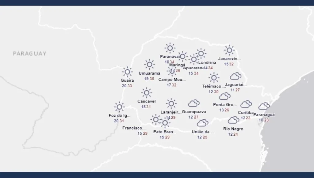 No oeste, noroeste e no norte paranaense as temperaturas passam dos 35°C em muitas cidades, com umidade relativa baixa à tarde. No extremo sul do estado não se descartam chuvas bem isoladas à tarde.